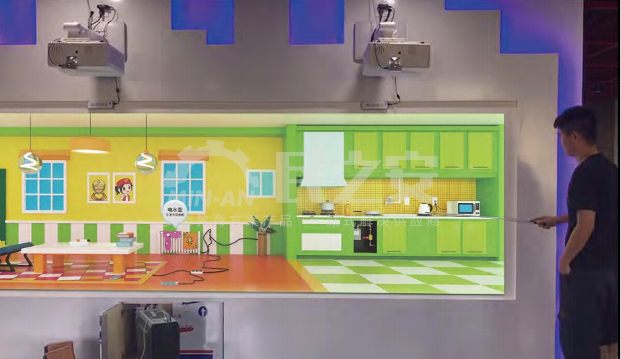 南京民之安投影融合版隐患排查,利用投影融合技术,实现超长屏幕的展示,结合互动触摸技术,实现多人同时查找生活中存在的安全隐患。其中,软件包含了图文知识点介绍,体验者可以在大屏上随意的拖动、放大等,同时还包含了家庭用电用气、电动车安全等知识视频。该软件主要包含了家庭和走廊两个场景,涵盖了生活中常见的隐患点,多达20余种,伴随着排查后的知识讲解以及生动的特效,达到寓教于乐的目的。