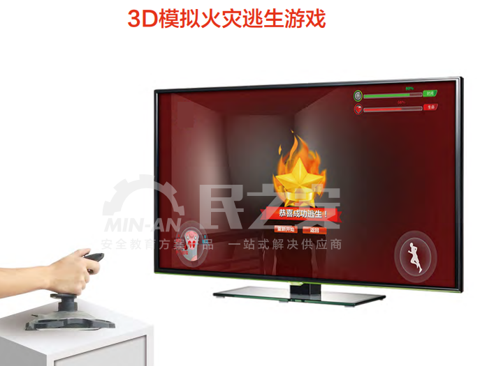 3D模拟火灾逃生游戏系统设置了火灾三维场景,使用虚拟仿真技术,还原了现实火灾中烟雾弥漫、能见度低的环境,通过手柄操作,移动角色,寻找正确的逃生路线。