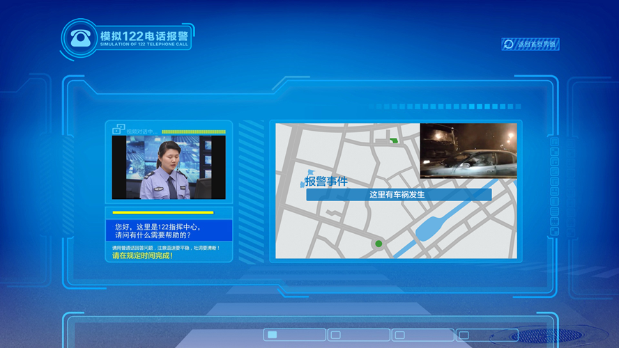 南京民之安模拟122电话报警系统设置了交通事故现场视频,体验者在观看视频后获得事故类型与地理位置等信息,通过模拟电话拨号与虚拟接警员进行人机交互,实现模拟122电话报警教学体验,并掌握实际报警流程与要点。