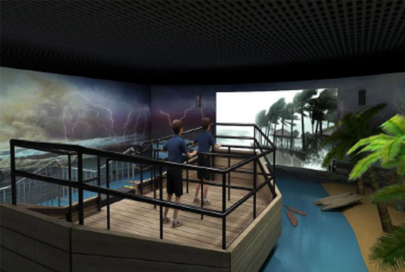 沉浸式暴风雨体验根据台风现象,采用先进的多媒体和实景结合技术,模拟台风登陆城市的景象,在真实的空间里模拟12级台风,使体验者有身临其境的感觉。台风体验项目体验者穿上雨衣进入体验区域,强风机和喷水机制造强风和水珠特效,投影画面与台风实时同步,用视频表现台风天气城市的状态,震撼的音响效果,实景式的视觉、听觉、触觉使体验者得到全方位的感受。通过体验台风降临,普及台风知识,提高自我保护意识。