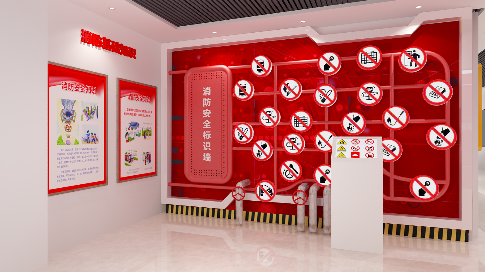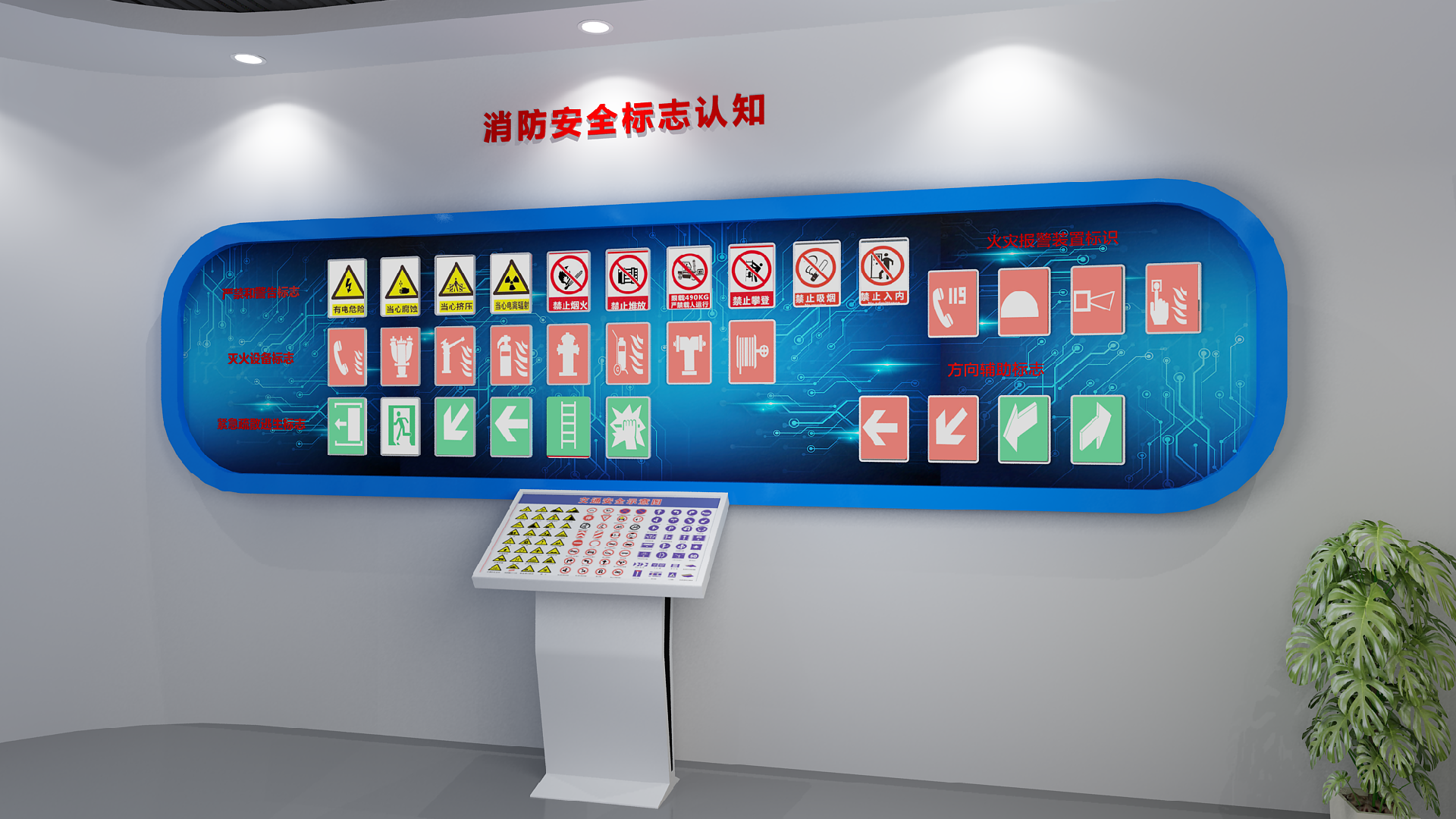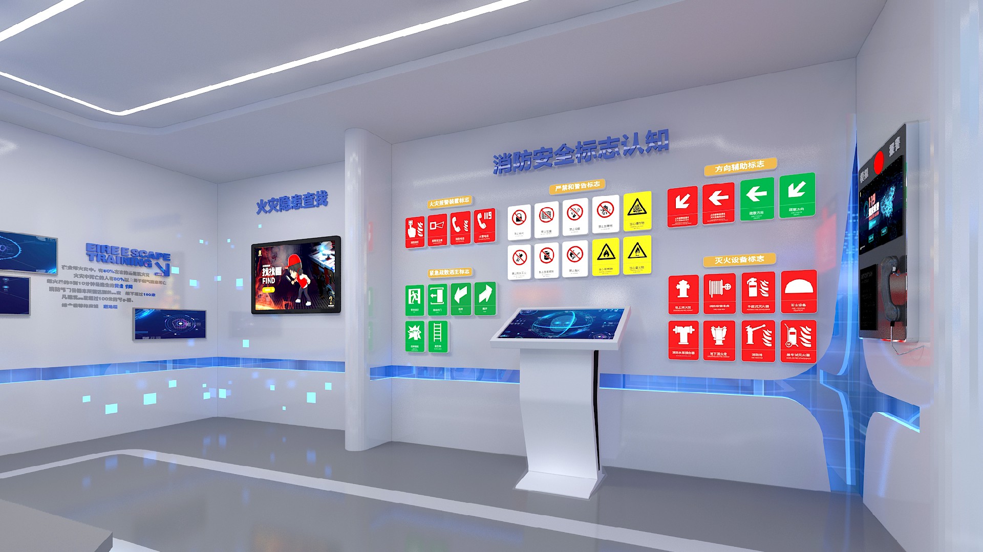 消防安全标志认知系统包含32个消防标志图标,通过点击触摸屏上标志图标,会有对应的语音播报,以及对应的灯箱会被点亮,使体验者熟悉和了解建筑中配备的各种消防标识和安装位置,帮助体验者养成在遇到危险情况下参照标志行动的行为习惯。